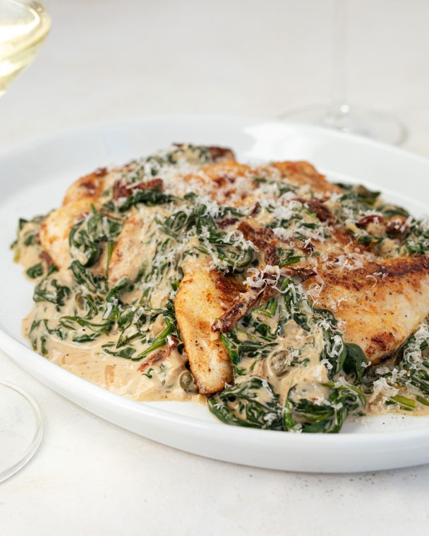 - Add the remaining olive oil and butter to the hot pan, add in the minced shallot, cook for 2 minutes, add the minced garlic, stir and cook for another minute. Add dijon mustard and stir to combine. Add the white wine, beef stock and Italian seasoning. Bring to a simmer and slower heat, cook for 3 minutes. Pour 3 tbsp sauce into a small bowl and mix in 1 tbsp cornstarch. Once thickened add back into the sauce. Add the sundried tomatoes, mix then the spinach. Stir and mix often until spinach is wilted, pour in the heavy cream, some fresh grated parmesan cheese and mix well.