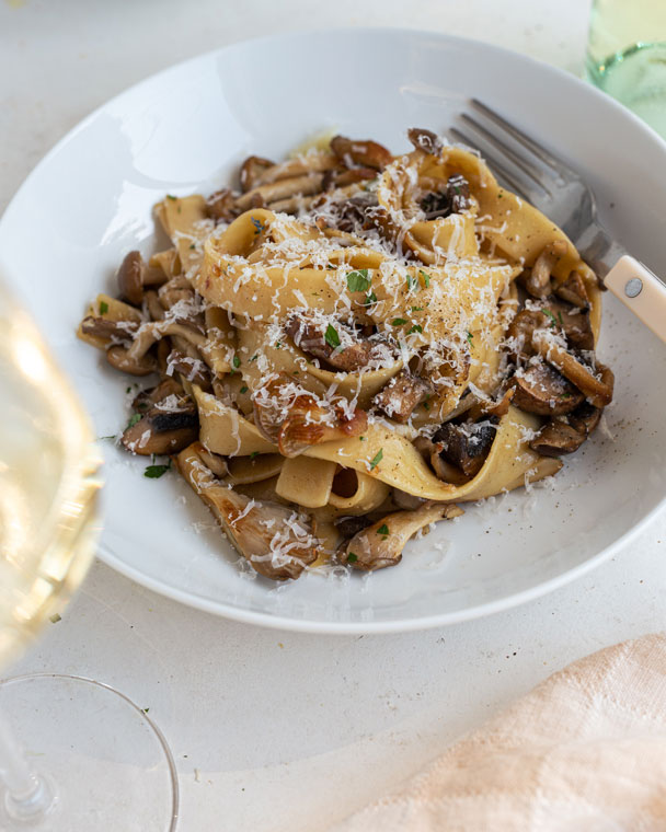 - Once the pasta is cooked, reserved ½ cup pasta water and set aside. Drain pasta and pour back into the pot. Pour in the cooked mushrooms, sauce and finely chopped parsley. Mix to combine, plate and top with fresh grated parmesan cheese and black pepper.